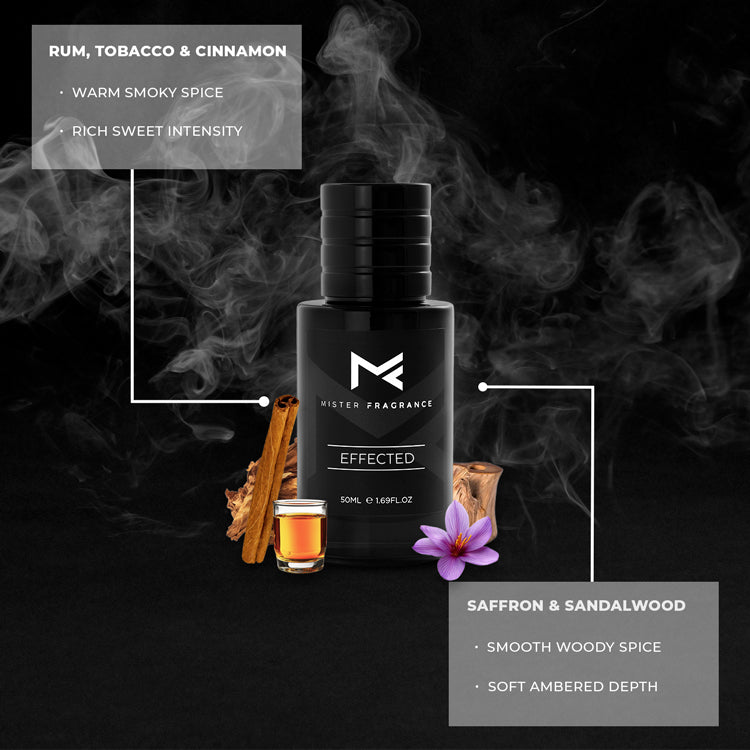 Effected is a unisex fragrance that is a warm, boozy, and spicy blend, primarily featuring notes of rum, cinnamon, tobacco, and, vanilla.