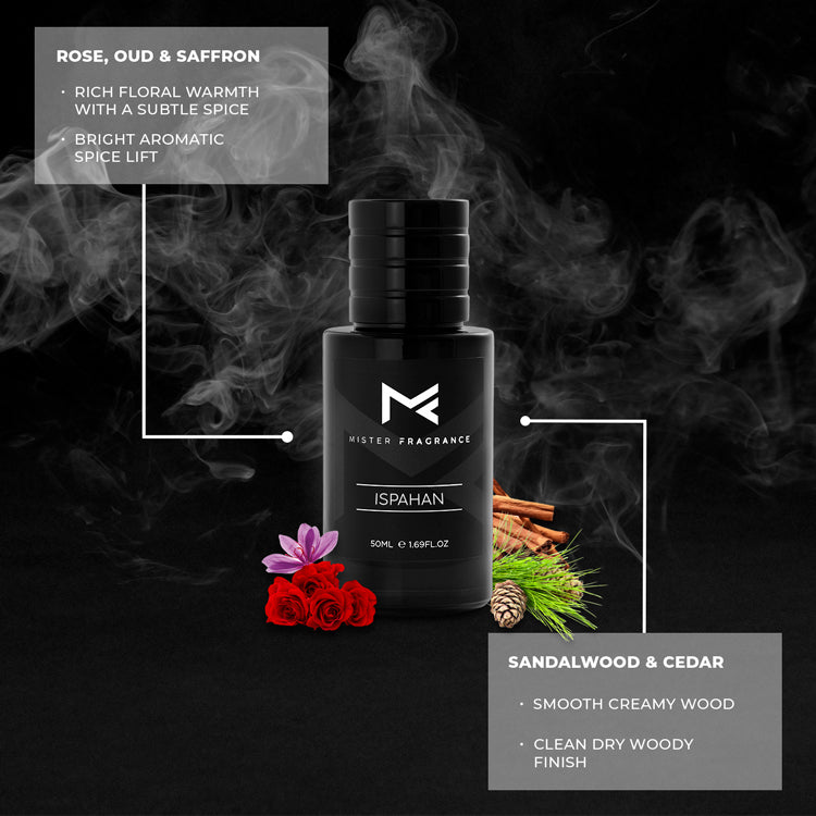 La rose a warm, woody, and floral blend of oud, rose, and spices. It opens with warm, ambery labdanum, followed by a heart of sensual rose that can have a slightly sweet or jammy quality, and a base that is strongly woody, spicy, and smoky with prominent oud, myrrh, and sandalwood.
