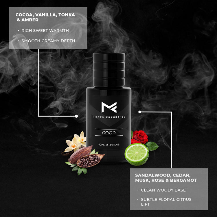 Good is a combination of sweet, floral, and gourmand notes for women. This fragrance includes sweet and bold top notes like almond and coffee, a heart of floral notes such as jasmine and tuberose, and a warm, sweet base of tonka bean and cocoa. This creates a sweet and strong, yet feminine and sophisticated fragrance.